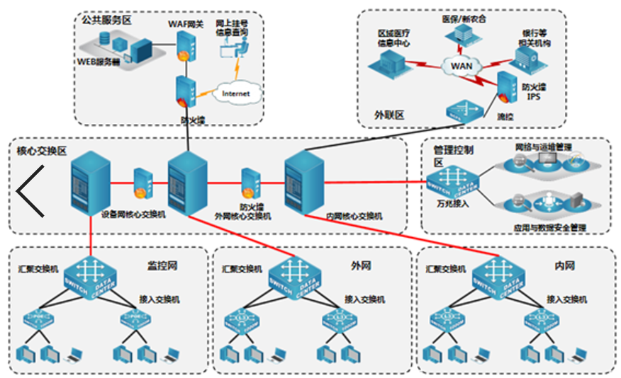 此方案主要分为内网、外网、设备网以及安全防护隔离四大部分,内、外、设备网各个子系统之间设备隔离,采用核心层+接入层两层交换式架构,局域网内部的二层高速转发