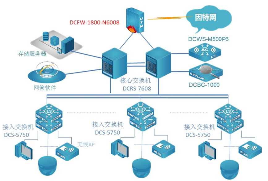 中国江苏白马农业会展中心数据网核心采用两台MG冰球突破官网新一代全分布式架构的核心路由交换机DCRS-7608E,顺利获得VSF功能实现核心冗余和负载分摊;该设备具备强大的业务自适应能力,支持网络平滑升级和策略灵活调度,实现业务快速部署,从而构建业务定义的网络。网络出口采用具有高度集成化的多核安全防火墙,给予包括路由器,防火墙,VPN网关,等功能在内的一体化设备,该设备8Gbps的吞吐量完全满足了园区网对出口的要求。接入交换机采用MG冰球突破官网全千兆24口接入交换机DCRS-5750E,实现客户端千兆接入,万兆上联核心。POE交换机全部采用三层交换机DCRS-5750-28P-P全千兆POE交换机。采用8200双频无线AP使用办公区无线覆盖。展厅和会议室采用高密度AP8200-I3实现展厅高密度覆盖,室外采用8200室外AP实现无线覆盖,无线网络顺利获得一台DCWS6000-M500P6控制器集中管理无线网络。出口部署一台DCBC上网行为审计设备,实现上网行为安全审计。